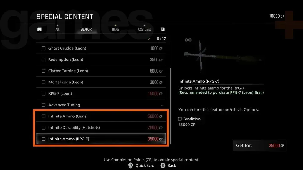 - Munição infinita para o RPG-7 (usado pelo Leon) — 35.000 CP