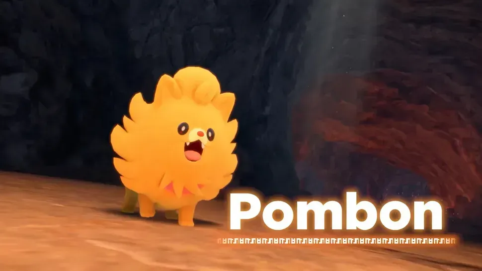 Pombon: Um cão sorridente em tons laranja e vermelho, claramente inspirado na raça pomeranian.