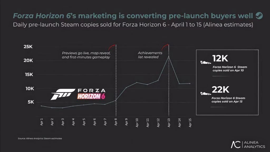 Segundo estimativas da Alinea Analytics, o jogo já ultrapassou 511 mil unidades vendidas na plataforma da Valve, com uma receita bruta superior a US$ 28 milhões. Com isso, Forza Horizon 6 já teria alcançado o posto de lançamento mais forte da franquia antes mesmo da estreia oficial.
